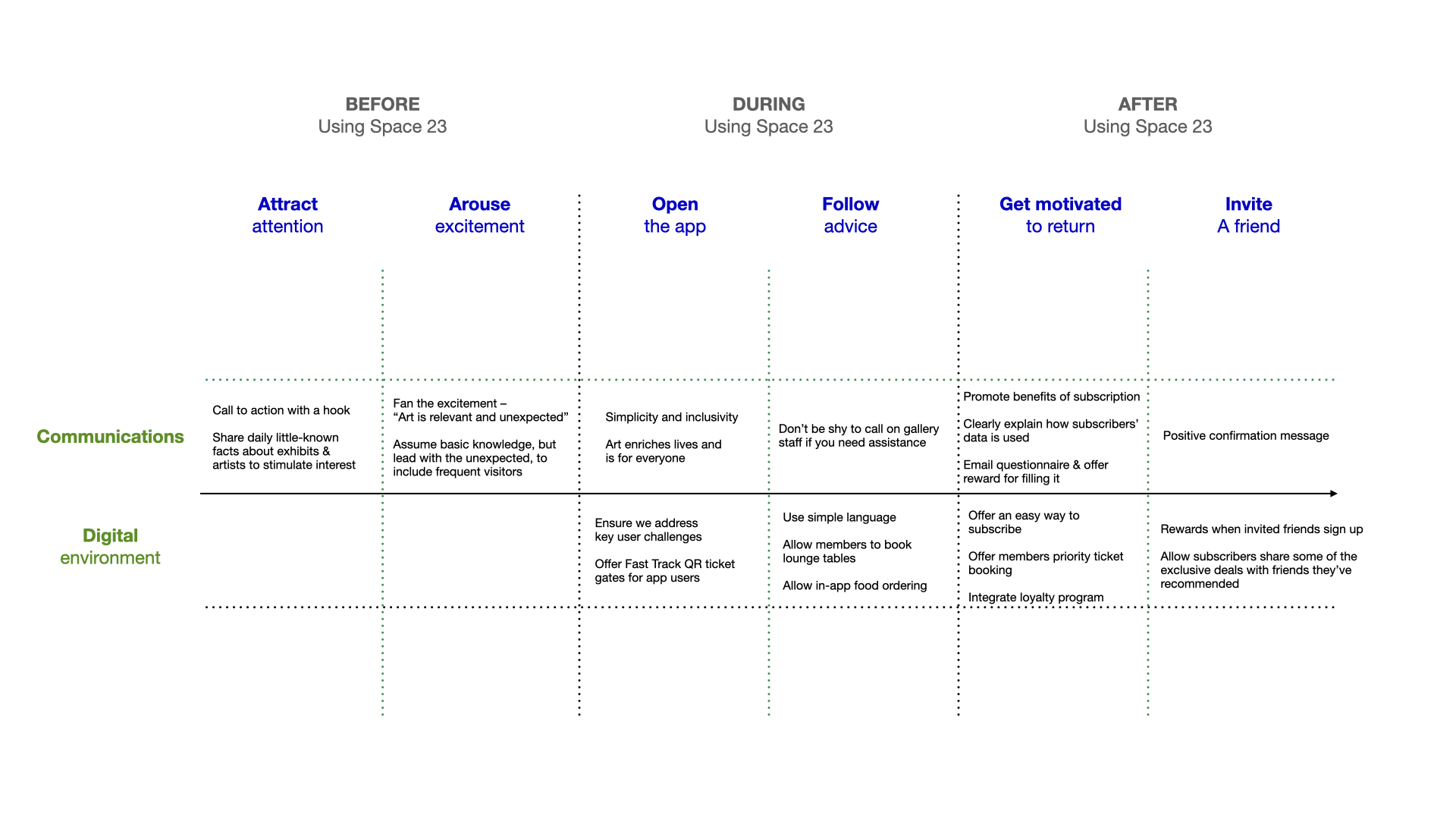 Develop a mobile app that would help Space 23 cultivate direct relationship with frequent gallery visitors (defined as those, invested enough to use the app) and reduce their churn, while maintaining overall growth of visitor footfall.
